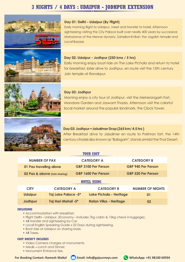 3 NIGHTS – 4 DAYS – UDAIPUR – JODHPUR EXTENSION